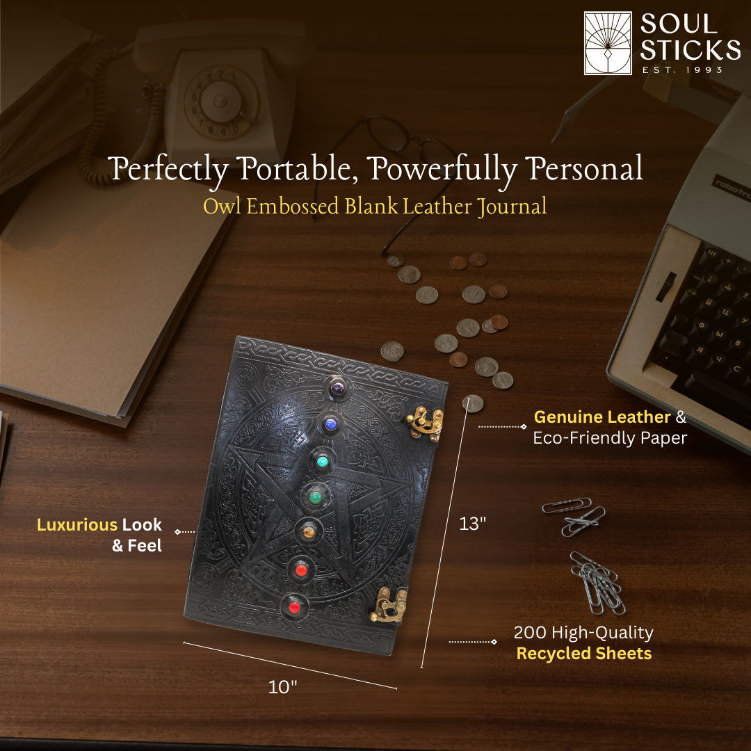 Black 7 Chakras with Stones Embossed Blank Leather Journal 10" x 13"