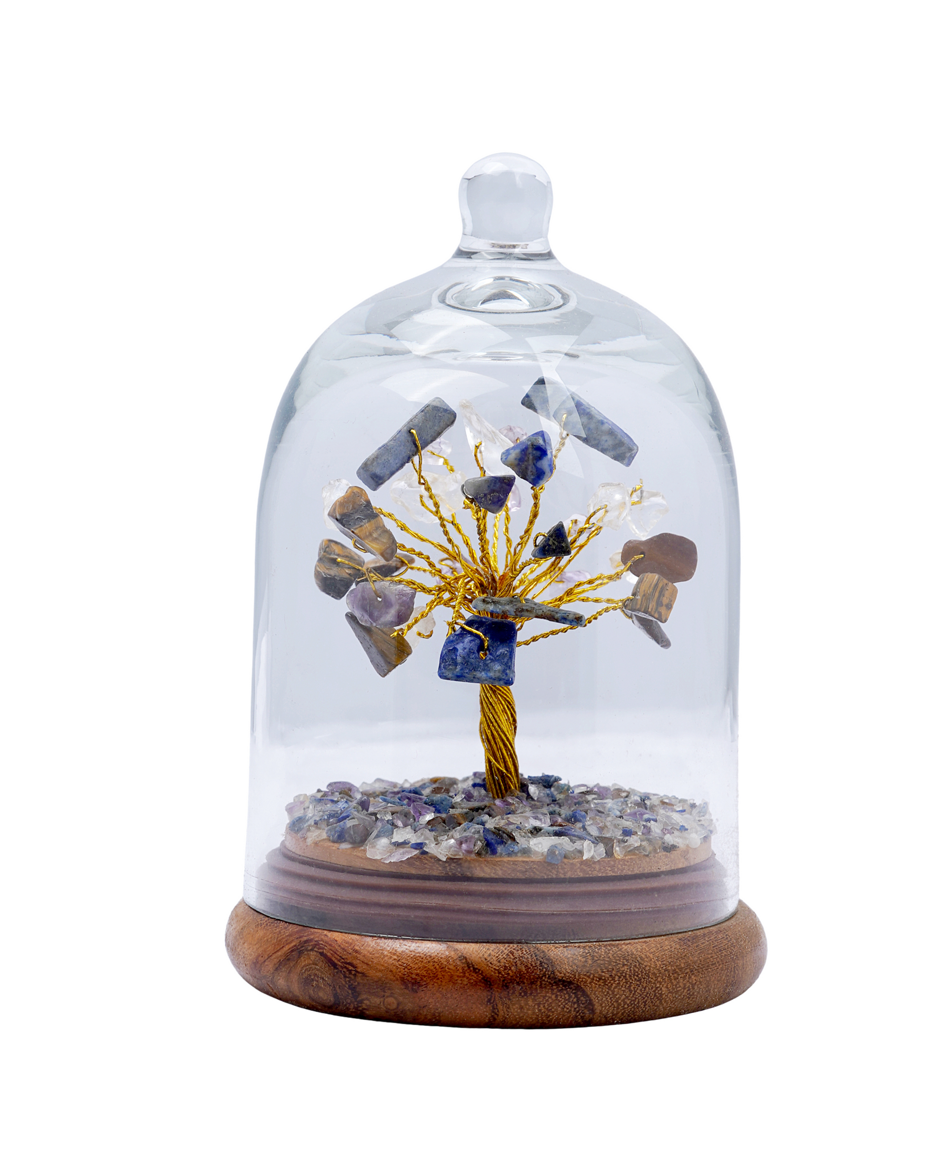 Each Dome Tree is a self-contained sanctuary, meticulously crafted by our partner artisans in India. Copper wiring – a natural conductor of energy – forms the sacred skeletal structure, cradling ethically sourced crystal ‘leaves’ (e.g., amethyst for tranquility, clear quartz for clarity) that cascade from branches to a moss-adorned wooden base. Encased in hand-blown glass, this eternal miniature forest: