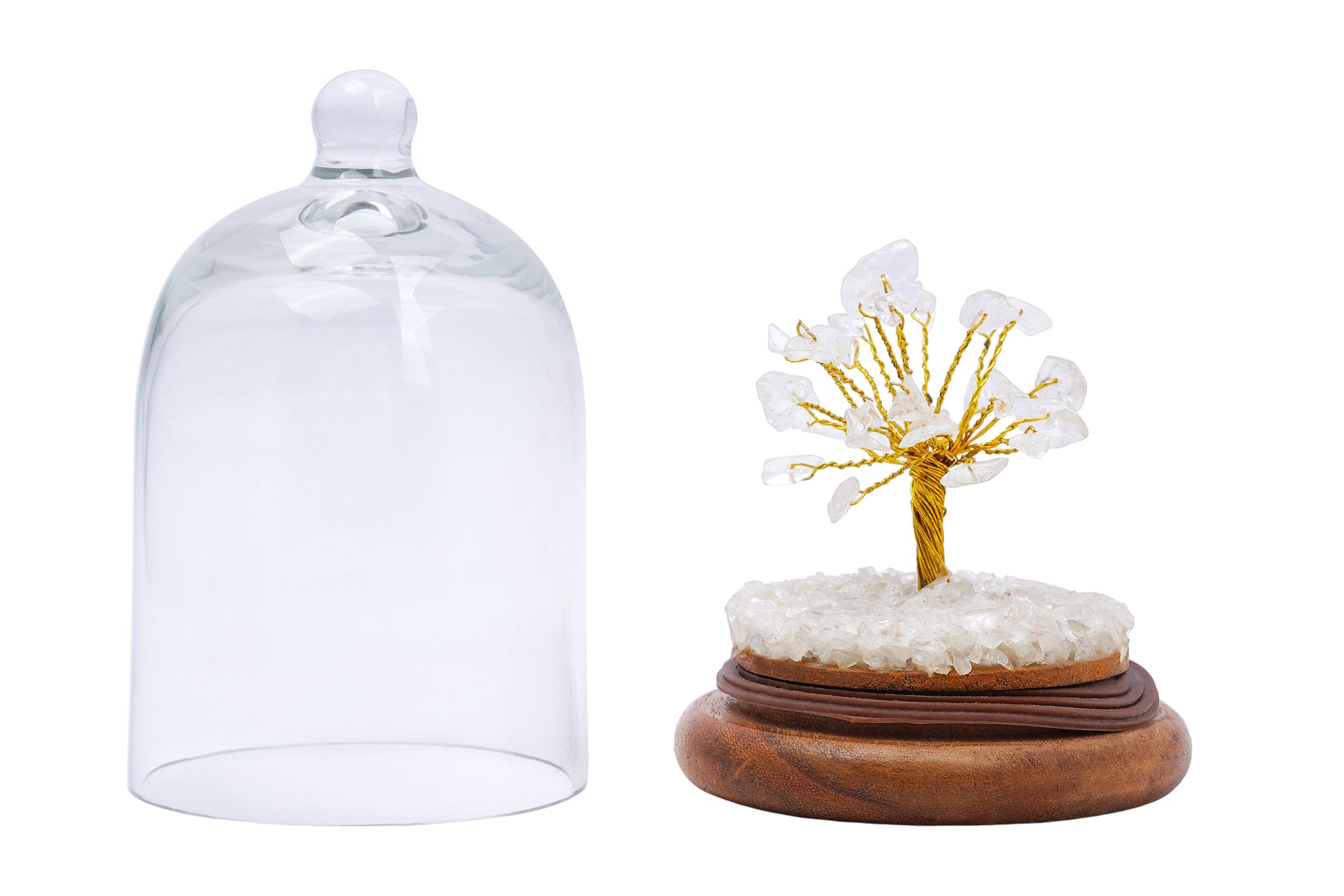 Each Dome Tree is a self-contained sanctuary, meticulously crafted by our partner artisans in India. Copper wiring – a natural conductor of energy – forms the sacred skeletal structure, cradling ethically sourced crystal ‘leaves’ (e.g., amethyst for tranquility, clear quartz for clarity) that cascade from branches to a moss-adorned wooden base. Encased in hand-blown glass, this eternal miniature forest: