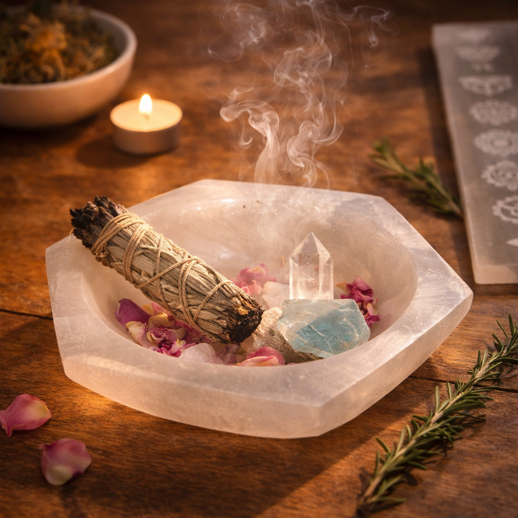 Elevate your sacred space with this 5-inch Selenite Hexagonal Plate. Hand-carved from natural selenite, its geometric shape adds a modern and serene touch. Ideal for cleansing and charging crystals, holding jewelry, or displaying small sacred items, this plate radiates calming, purifying energy while enhancing altars, meditation spaces, or home décor.